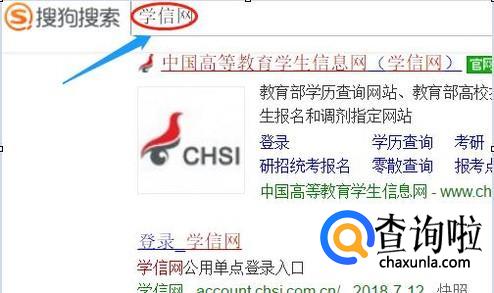 打开搜狗搜索框,输入"学信网"三个字,然后搜索到的网页里排在前两个的都是学信网的官网,如下图;