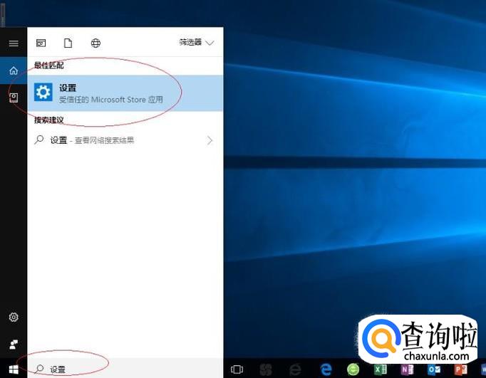 如图所示,搜索框输入"设置"。Cortana(小娜)显示搜索结果,点击"最佳匹配→设置"项。