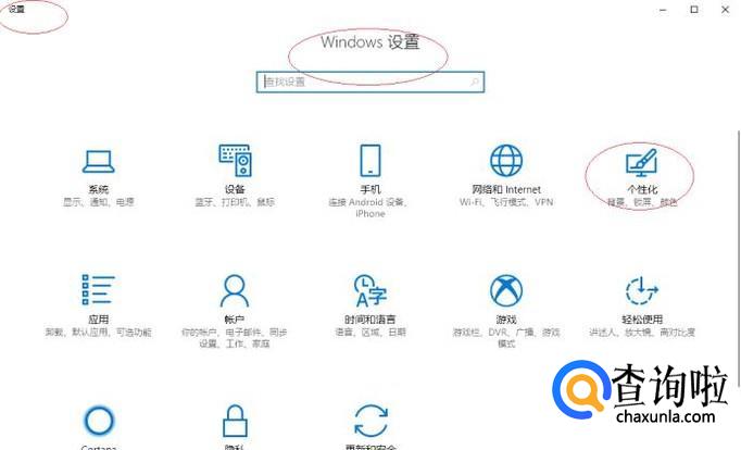 唤出"Windows 设置"程序窗口,如图所示。点击右侧"个性化"图标,用户可以根据自己的喜好和需要对系统进行设置。