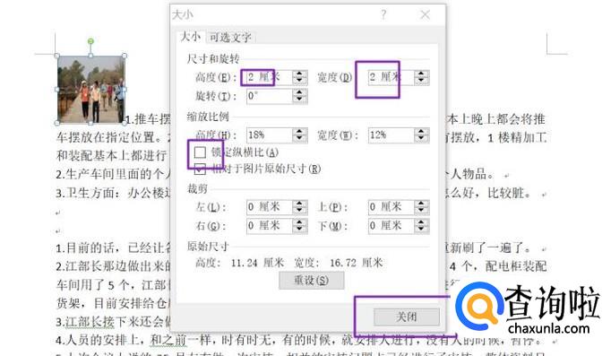 弹出的界面如图,我们将锁定纵横比的勾选取消掉,然后将高和宽均改为2,然后点击关闭;