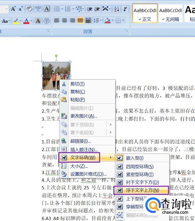 我们继续右击图片,弹出的界面选择文字环绕,然后选择悬浮文字上方;