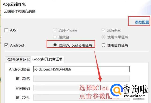 接着在弹出的APP云端打包界面中我们勾选使用DCloud公用证书,然后点击参数配置,如下图所示
