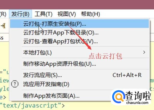 接下来点击顶部的发行菜单,然后选择云打包-打原生安装包选项,如下图所示