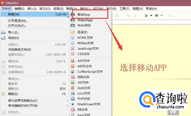 首先打开Hbuilder软件,点击顶部的文件菜单,选择新建下面的移动APP选项,如下图所示