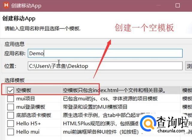 接下来在弹出的创建移动APP界面中,我们创建一个空模板的APP应用,如下图所示