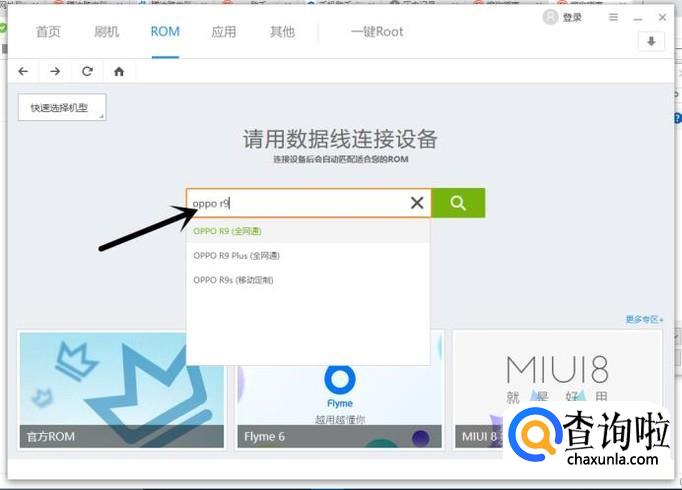 等待电脑识别手机后,点击 rom ,在搜索框中输入 oppo r9m