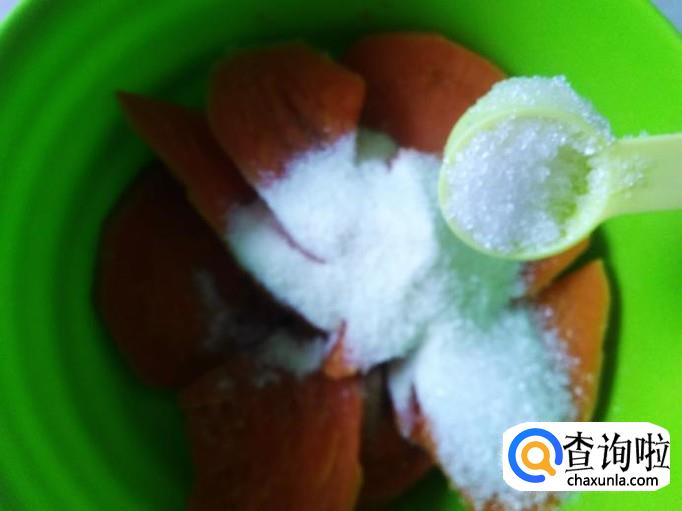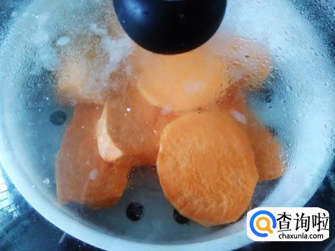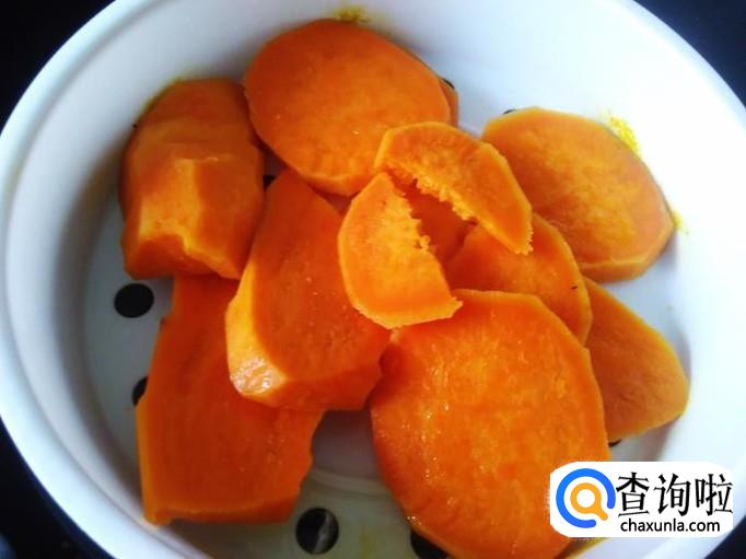红薯去皮切成厚片,放置锅里大火蒸15分钟左右。【蒸到松为止】