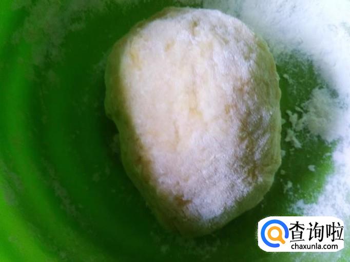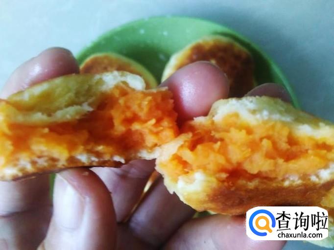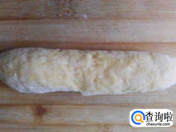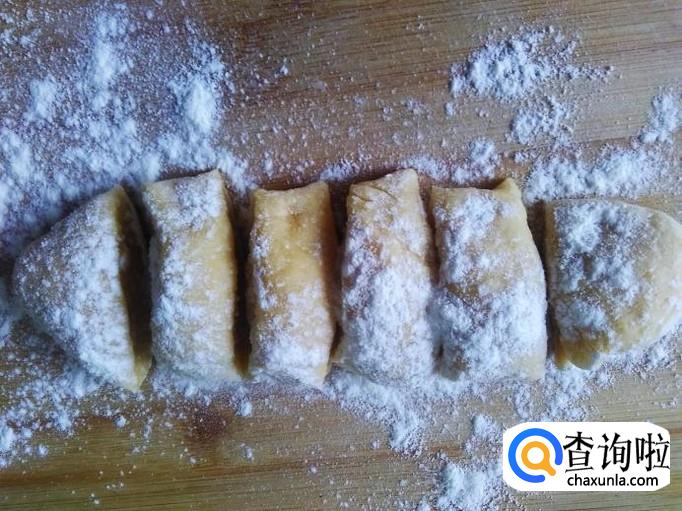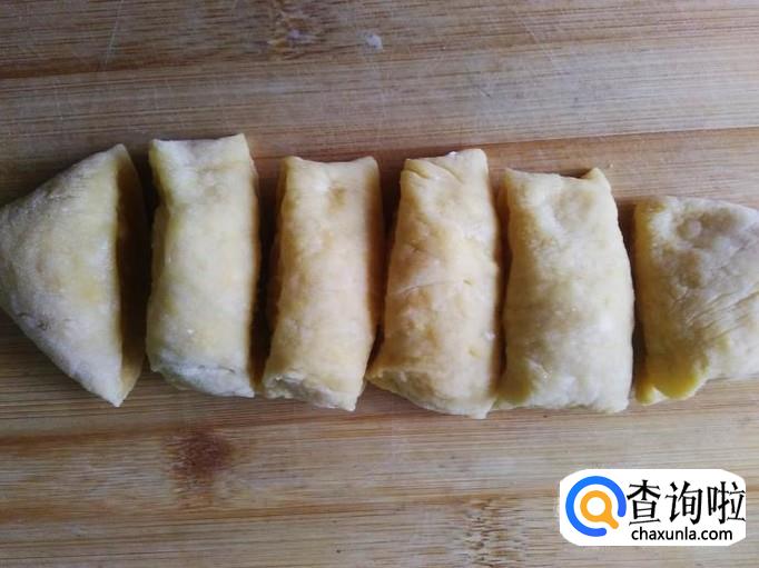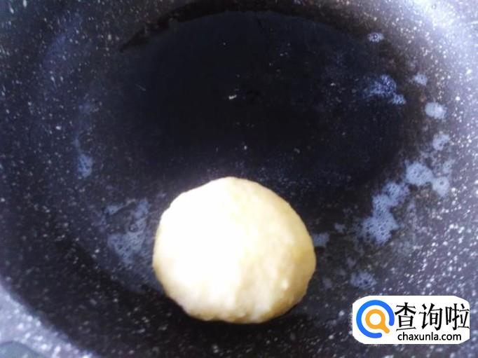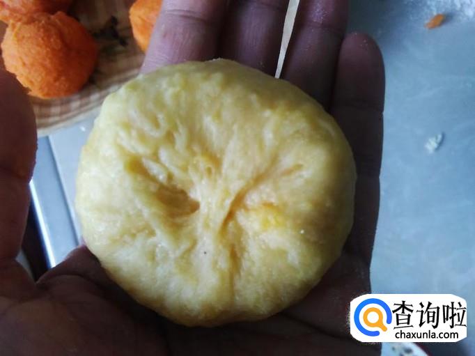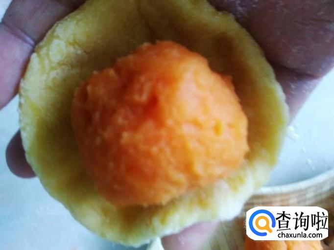 用切好的面团压成薄饼状,然后放红薯丸子进去收口。