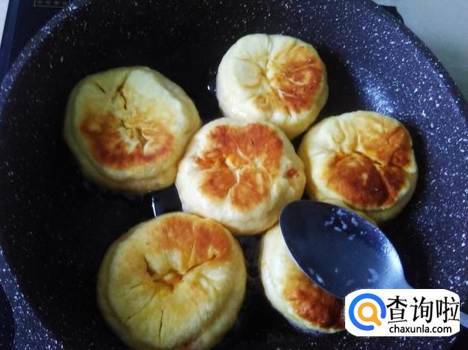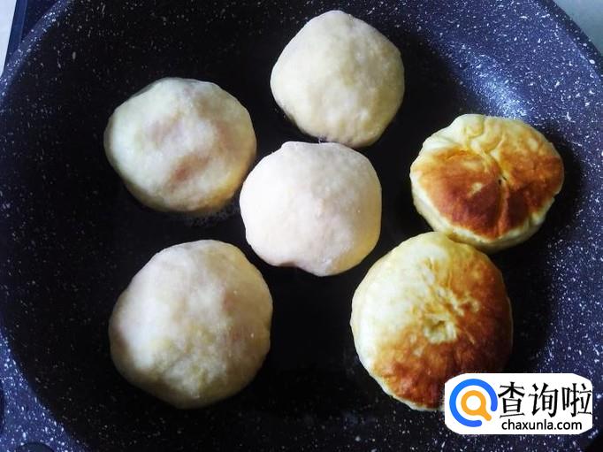 煎至3分钟左右,把包子翻转,然后用勺子把包子压扁一些。