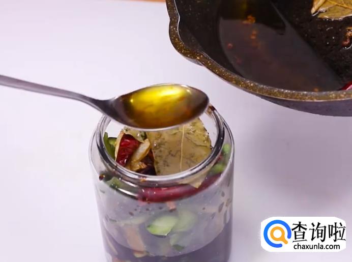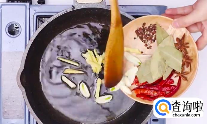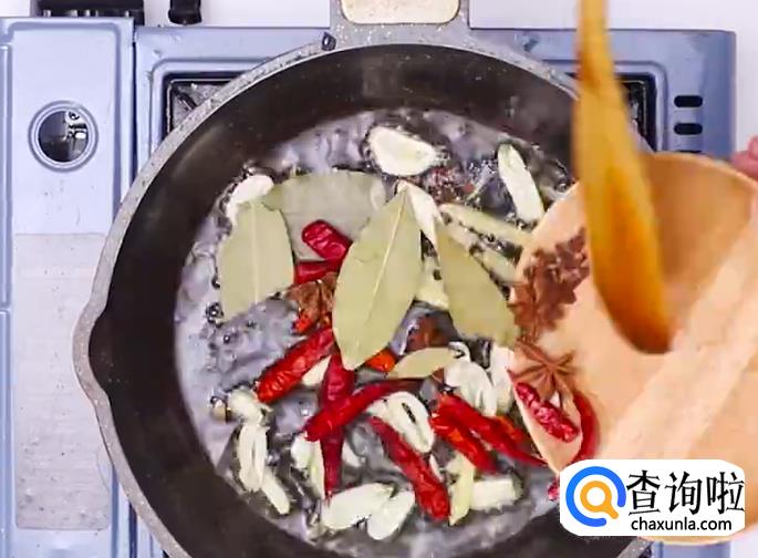 之后倒八角、香叶、花椒、辣椒翻炒。