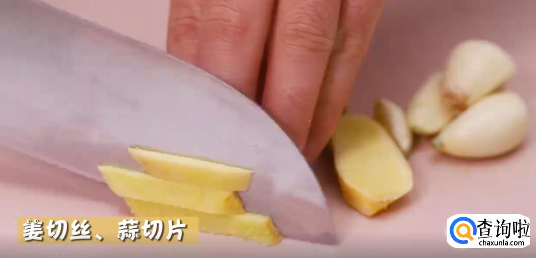 之后重起一锅热油,加入姜丝、蒜片翻炒。