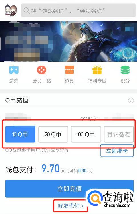 在充值界面选择自己要充值的Q币数量,然后点击好友代付。