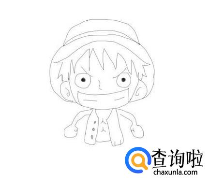 在头部下面画出路飞的身体,然后再画出路飞的两只胳膊及手部,如图所示: