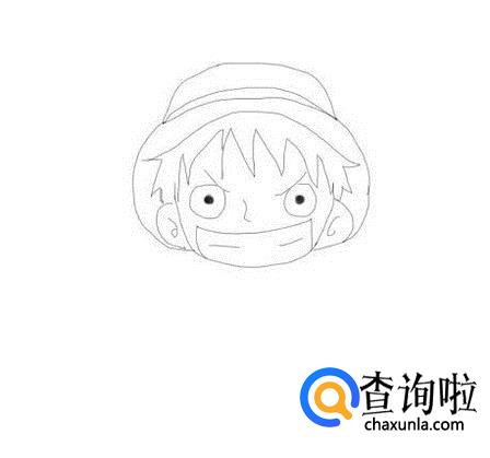 再在路飞的面部上画出路飞的眉毛,然后画出眼睛,鼻子和嘴巴,如图所示: