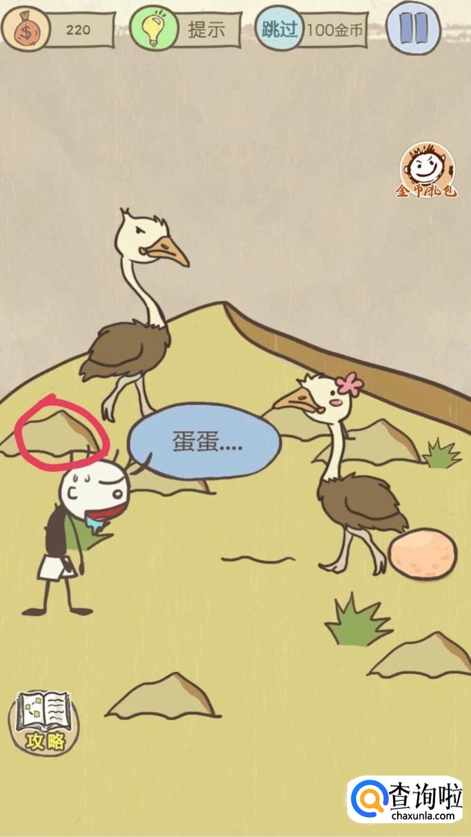 第二十三关:点击史小坑正上方的沙坑,移开他然后拿出里面的铲子,拖动铲子往史小坑身前的鸵鸟地面上挖坑就可以自动通关了。