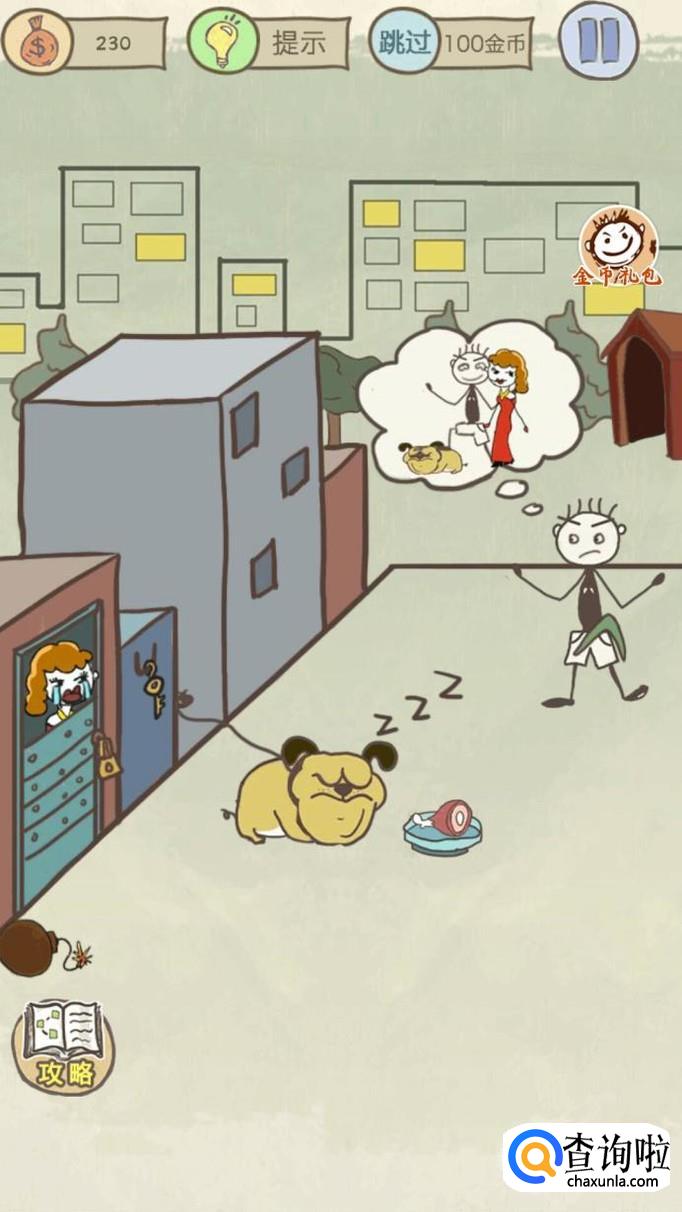 第二十四关:首先我们需要点击骨头放在史小坑上方的狗洞旁,然后吸引出狗洞里的女狗,这个时候要马上点击她,大狗就会被女狗吸引走,史小坑就可以救出美女啦