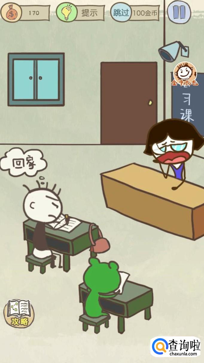 第十八关:点击书包,老师在自习的时候睡觉,然后把黑笔拖到史小坑身上。老师在自习的时候睡觉,这怎么能忍,小伙伴们要帮助小坑将黑笔画在老师的眼镜上就可以顺利下课了。