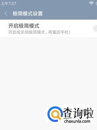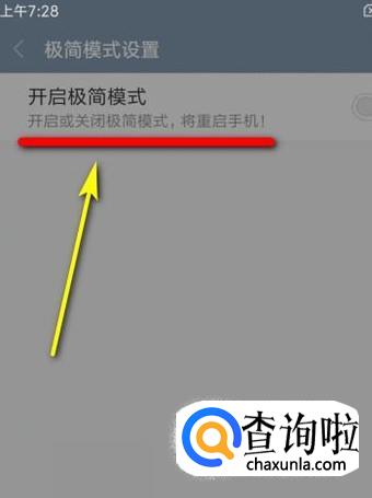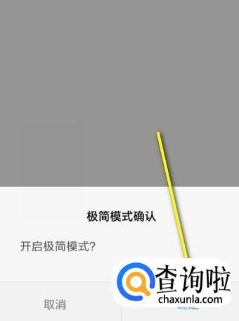 这里只有一项“开始极简模式”;手指轻点一下右侧的开关。这时,在屏幕的底部这里弹出一个对话框。询问我们是否要开启极简模式。