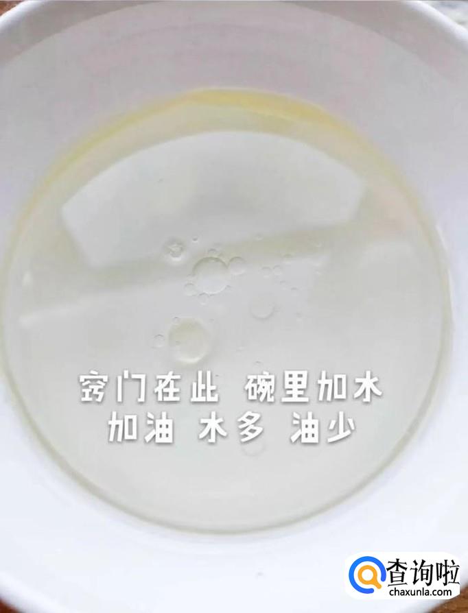接着在一个碗中加入适量的水和油,搅拌均匀,如下图所示。小贴士:注意水要比油多。