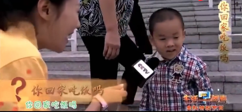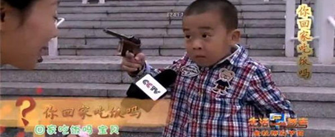 2014年,央视综合频道《生活早参考》十一特别节目,记者走访20个城市,询问5000个人“你回家吃饭吗?”,其中有不少让人捧腹的回答,例如“是美食节目吗?”、“我妈让你俩(记者)喊我啊?”,还有人被记者拍肩,一转头看到摄影机立刻吓得拔腿跑。其中,最让人印象深刻的就是这个拿玩具枪的小男孩。