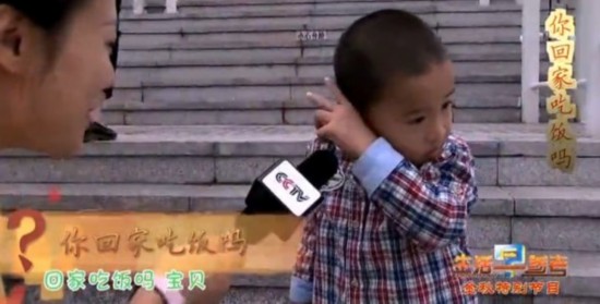 当时记者采访到小男孩的时候,依照惯例问他“你回家吃饭吗?”,小男孩可能没有听清主持人说了什么,歪着头对着主持人。