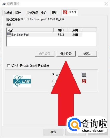 点击“停止设备”就可以关闭笔记本触摸板功能,点击“启用设备”就可以开启笔记本触摸板功能。