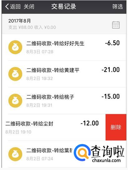 进入交易记录,再左滑需要删除的记录,点击红底白字“删除”。