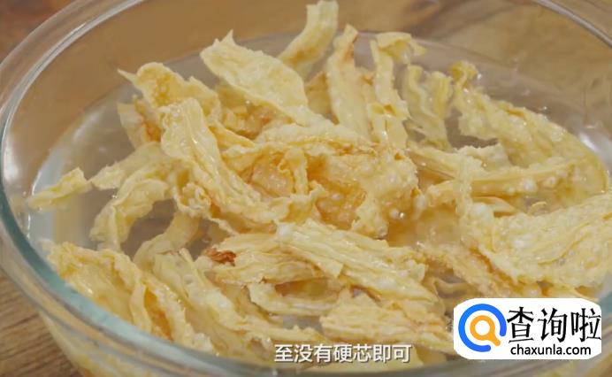 在炖煮的时间里,可以来处理腐竹。锅中油烧热至6成,放入干腐竹,炸至金黄,然后快速捞出,放入温水里浸泡10分钟左右,直到没有硬芯即可。