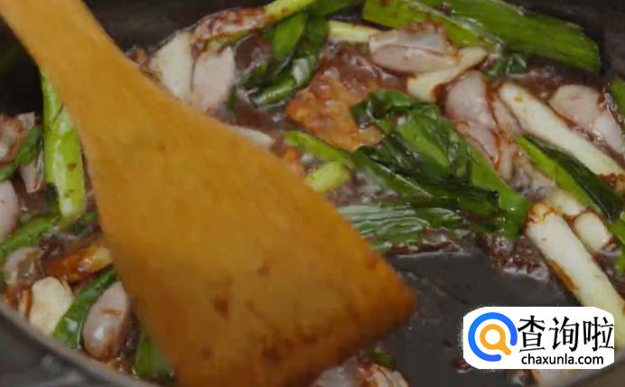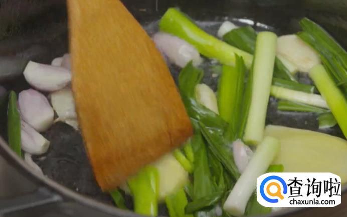 接着,热锅起油,放入红葱头、蒜片、姜片和蒜苗段,煸炒出香味。