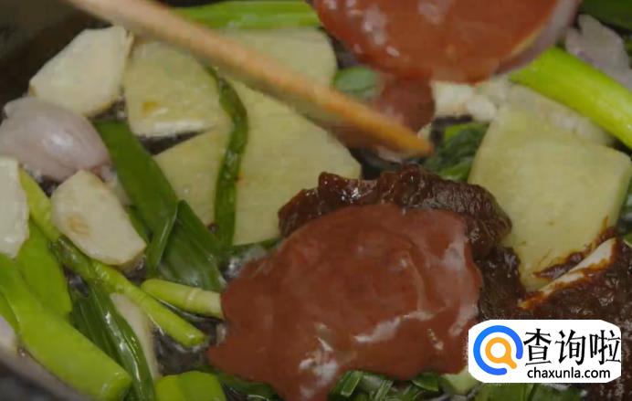 然后,再加入豆瓣酱和柱侯酱以及捣碎的红腐乳酱,翻炒均匀后,下冰糖和事先泡过水的陈皮。