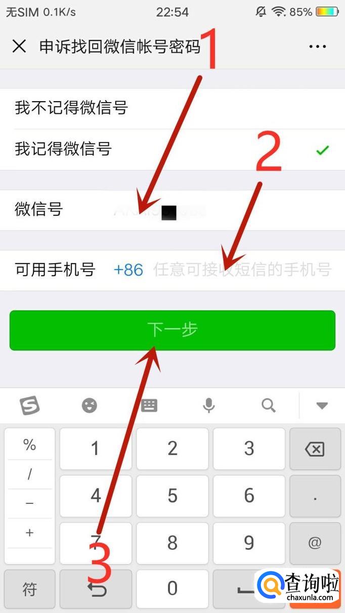 进入之后,填写微信号,再填写一个可以接受短信的手机号,点击“下一步”,如图所示。
