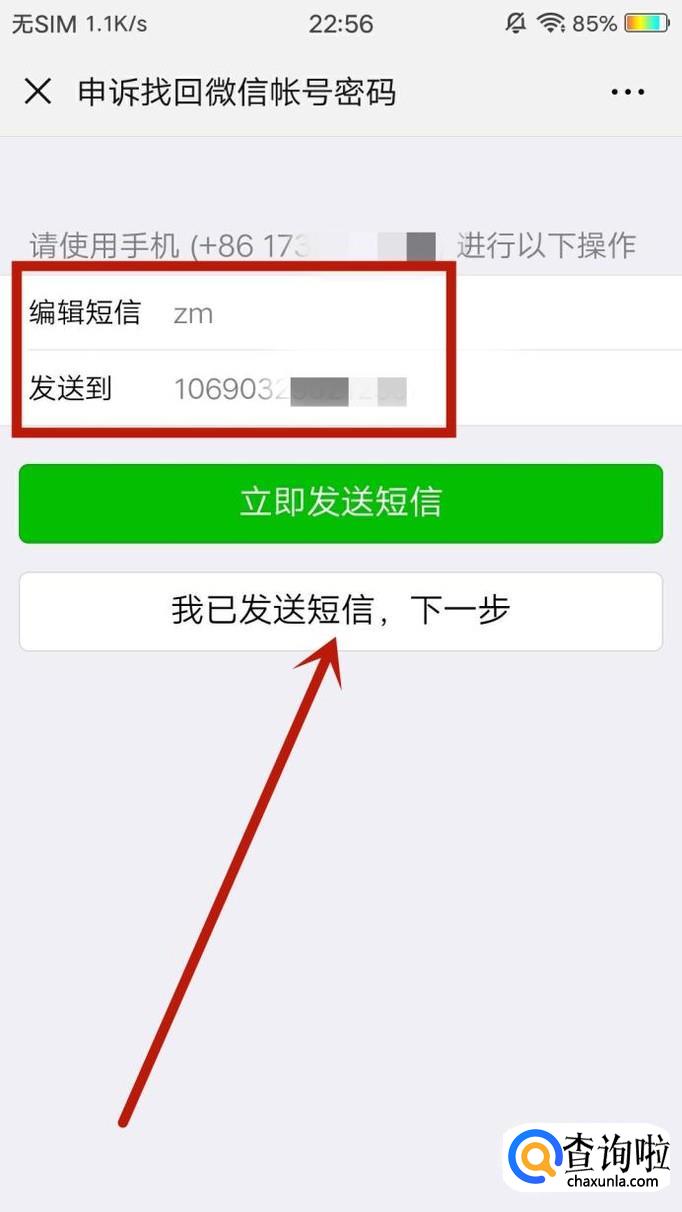进入下一页面,用填写的手机号码发送图示位置的短信,发送后点击“我已发送短信,下一步”,如图所示。