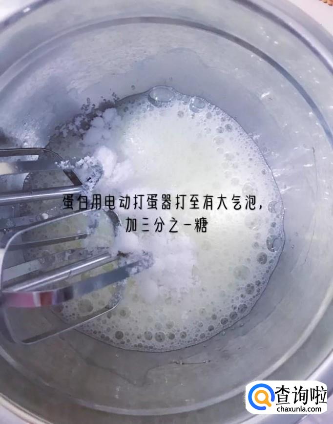 - 01首先将鸡蛋蛋黄蛋清分离,蛋清用打蛋器打到起大泡,加入1/3的糖,继续搅拌均匀,如下图所示。