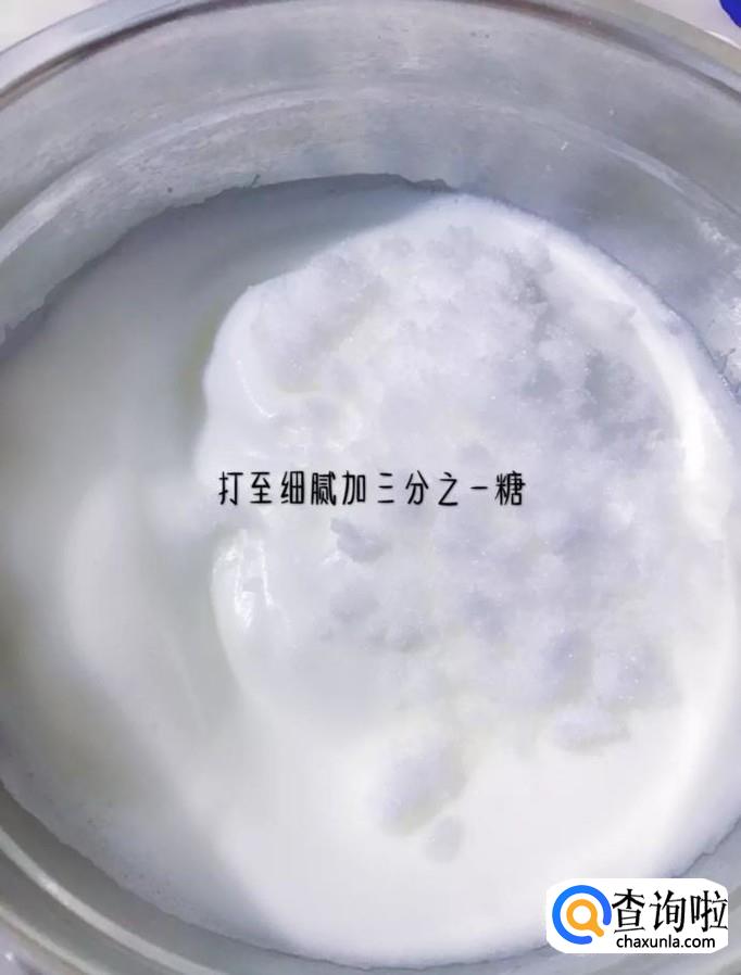 - 02                                                                                                            等到打到细腻之后继续加入1/3的糖,继续打发,如下图所示。