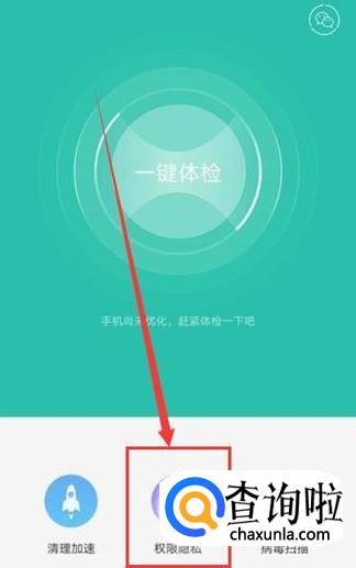 进入手机管家,选择“权限隐私”进入下一页面,如图所示。