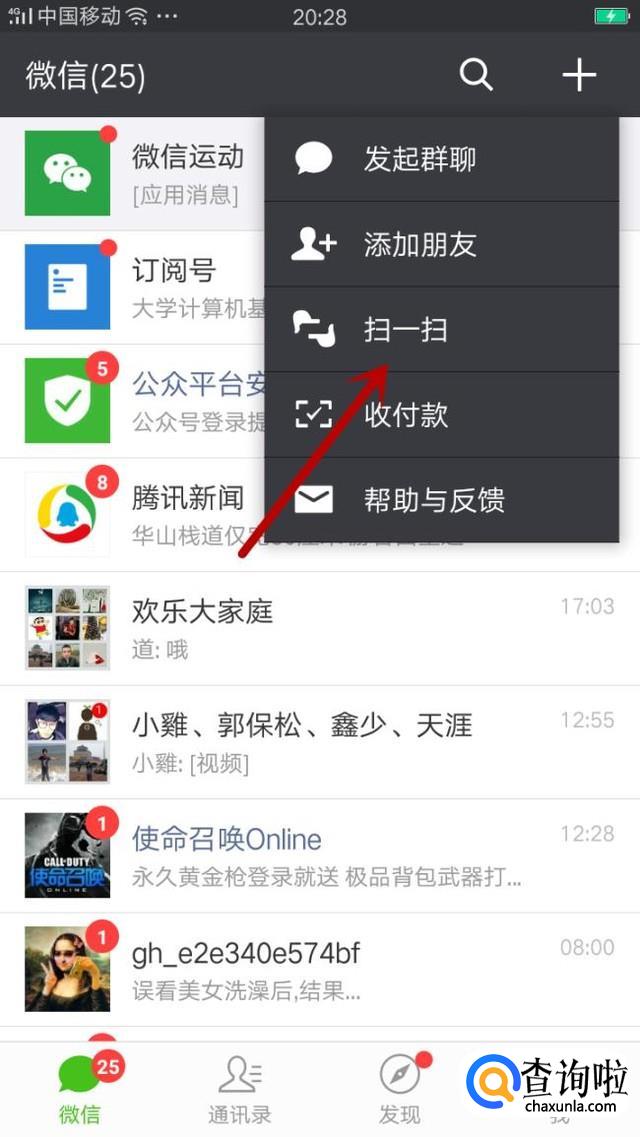 之后会弹出一个选项卡我们点击扫一扫,如图所示。