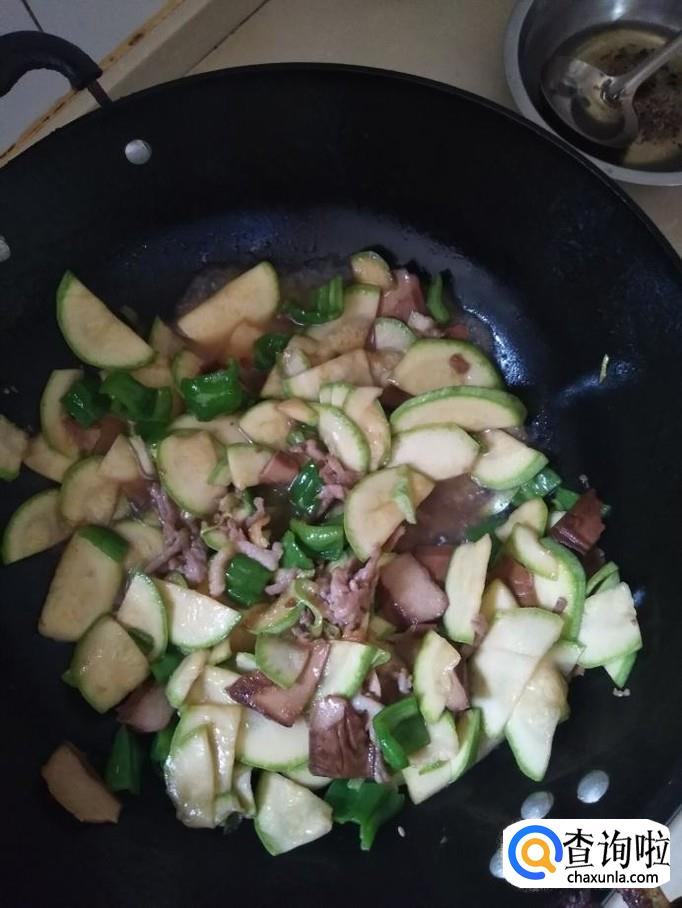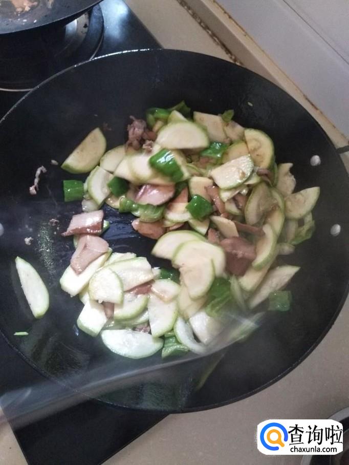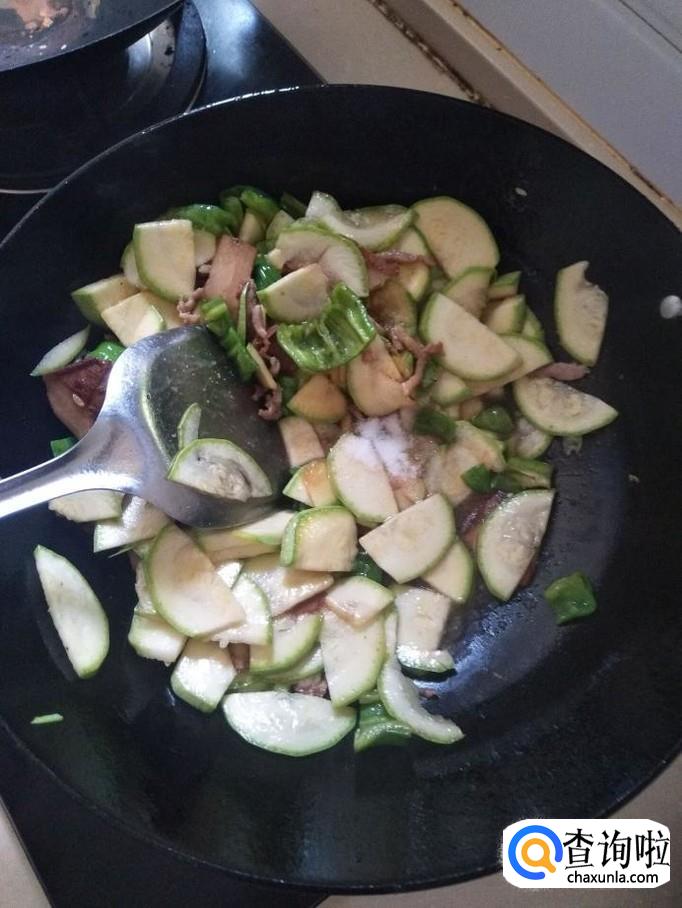 翻炒至肉丝泛白时,西葫芦片下锅,放入适量盐,味精,白糖翻炒,再浇上少许生抽提鲜。