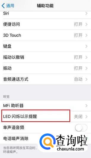 在辅助功能设置界面的“听觉”一栏中,点击“LED闪烁以示提醒”这一选项。