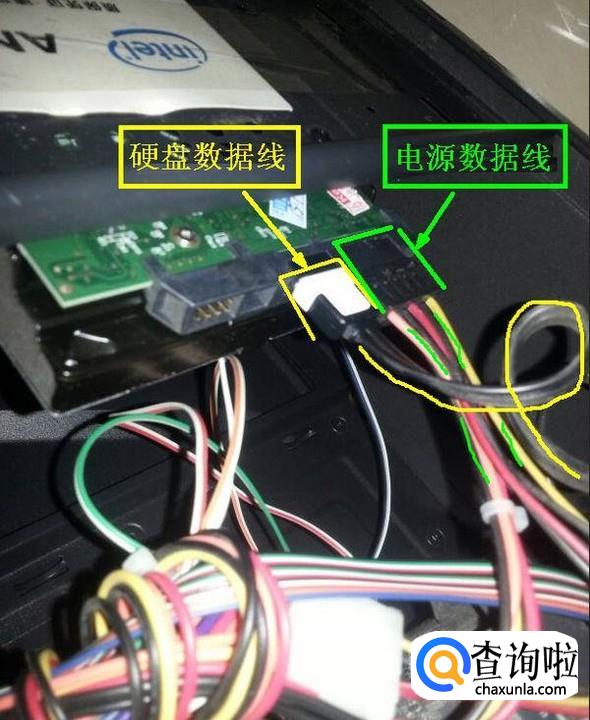 数据线一端连于硬盘,另一端和主机的SATA接口相连。SATA接口在主机上会有标识。
