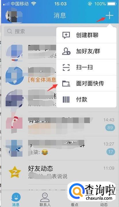 首先我们登录手机qq后点击右上角的+进入到面对面快传的功能。