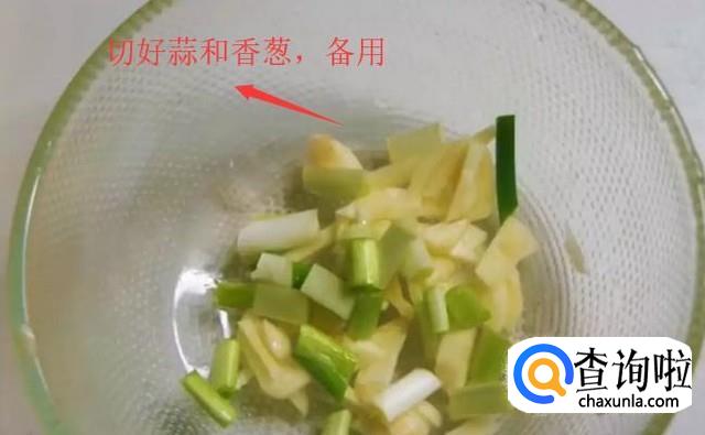 然后将准备好的蒜切成碎末状,将香葱切成小段,如下图所示