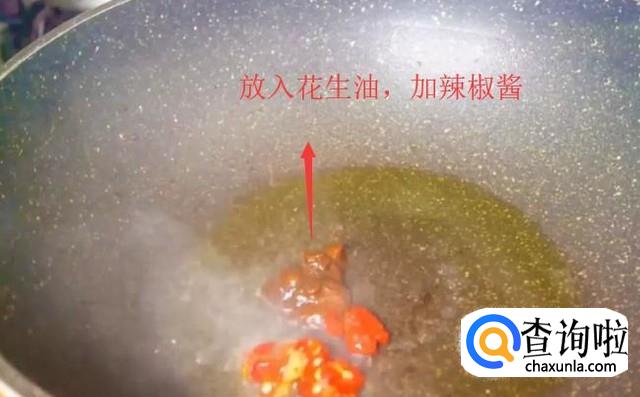 接下来我们在锅里放入花生油,然后加入一点辣椒酱,像下图这样