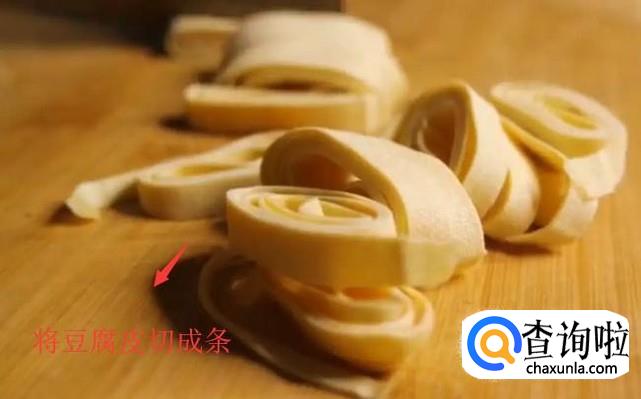 首先我们将准备好的豆腐皮切成条状,像下方图片这样
