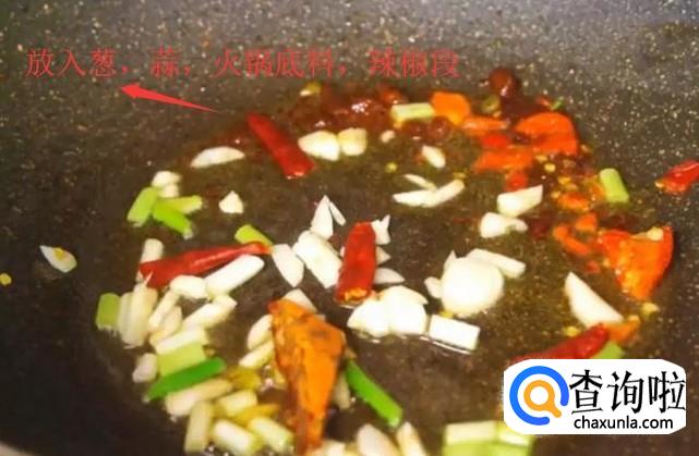 然后放入切好的葱和蒜,并加入火锅底料和辣椒,注意火锅底料别加太多