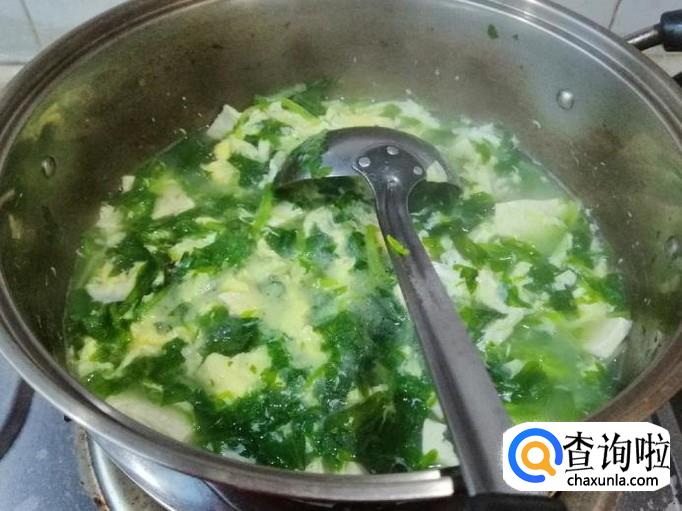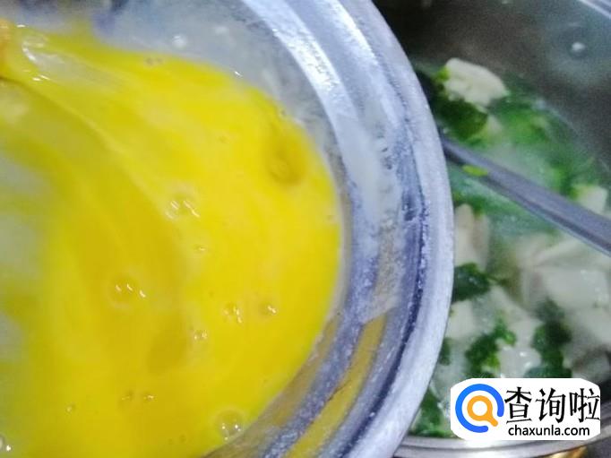 最后加入熟芹菜叶子煮开,然后加入备好的鸡蛋液,鸡蛋液尽量从锅边,转一圈倒入,这样倒入的蛋液比较均匀。