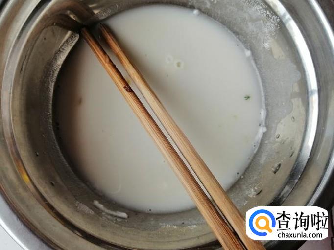 煮开后就可以加入,之前调制好的面糊,边到面糊边用勺子搅拌,以免粘锅底,搅拌均匀后,加入适量食盐。