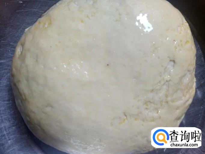 盆里再次放入鸡蛋和食用油,搅拌一下,用温水活至面团光滑。