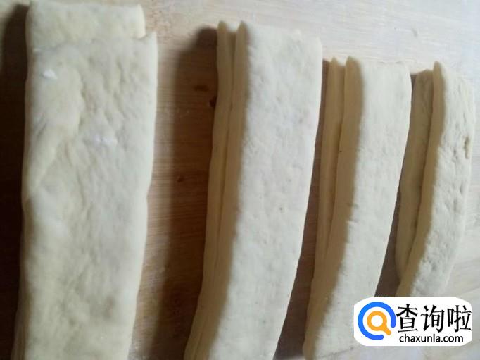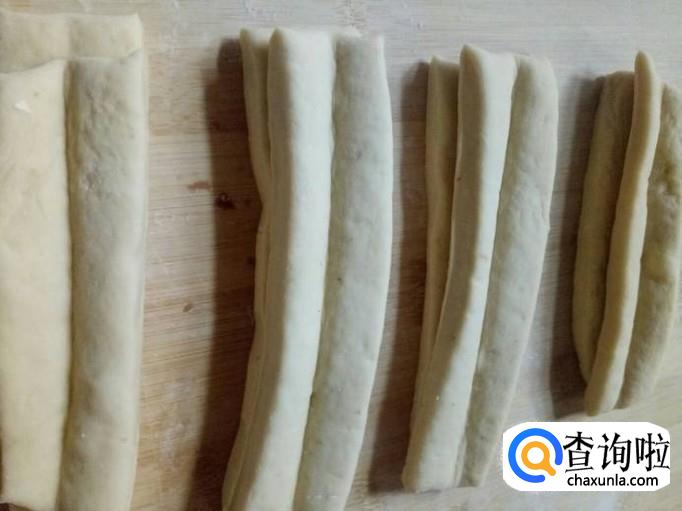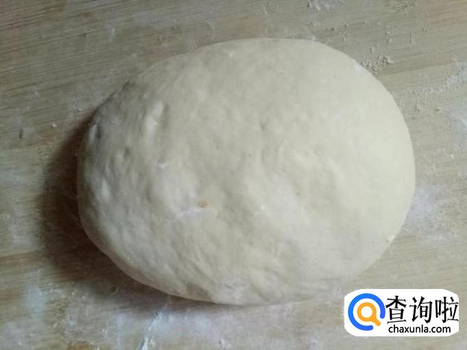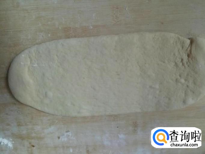 面团发好以后,再次揉搓,然后擀成略厚点的椭圆面片。