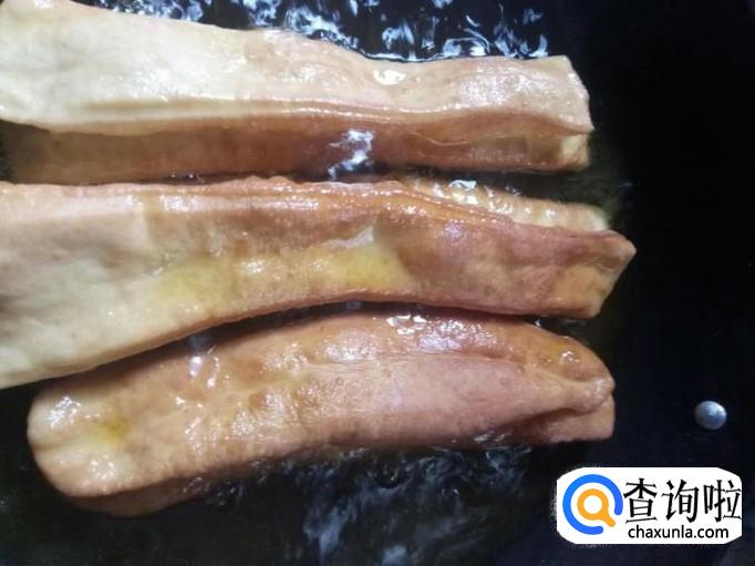 用手捏着面片的两端稍微抻一下,放到油锅里,等到油条浮起来。