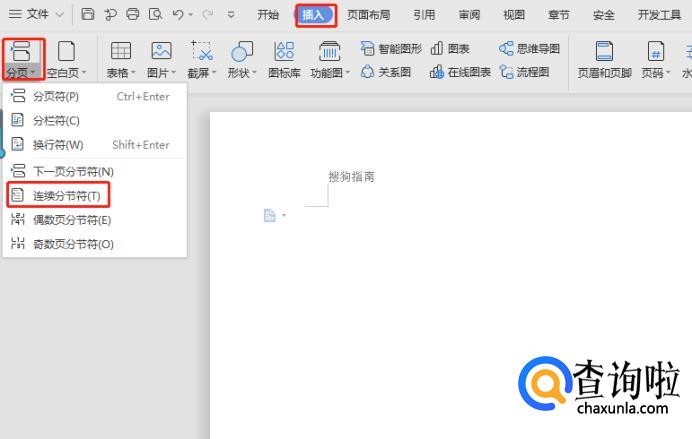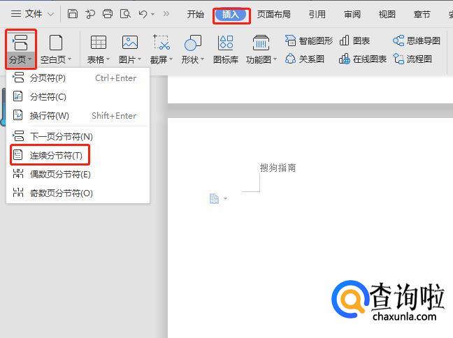 点击顶端菜单栏中的【插入】选项,点击左上角【分页】的图标,在弹出的菜单栏中点击【连续分节符】选项。